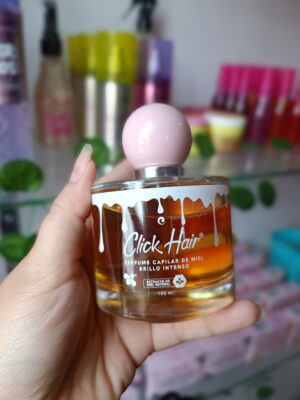 El perfume Miel de Click Hair es un perfume capilar con un aroma dulce y cálido que combina notas de miel, caramelo, ámbar y vainilla. Está formulado para ser aplicado en el cabello, ya que contiene extracto de miel para hidratar, dar brillo y sedosidad, así como ácido hialurónico y feromonas. Además, tiene propiedades termoprotectoras y ayuda a controlar el frizz y a suavizar el cabello sin engrasar.